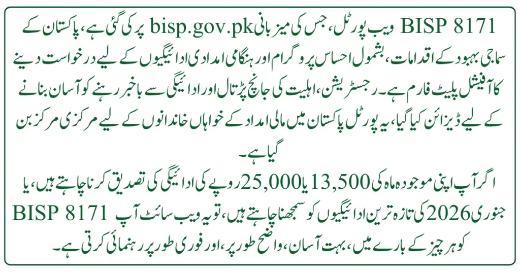 If you want to verify your current month’s payment of 13,500 or 25,000 rupees, or understand the latest BISP 8171 January 2026 payment updates, this website guides you on everything, very simply, clearly, and quickly.
