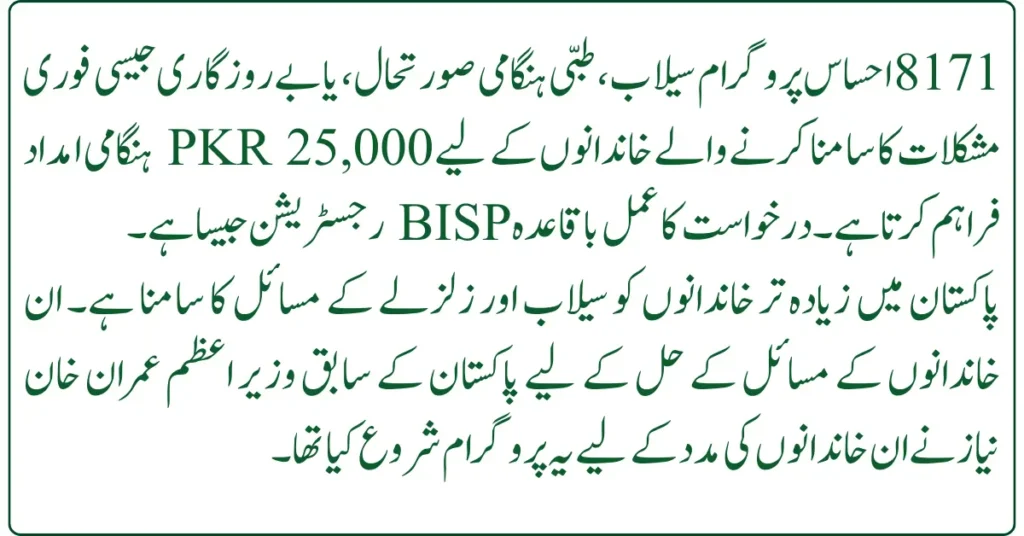 The 8171 Ehsaas Program provides PKR 25,000 emergency relief for families facing urgent hardships such as floods, medical emergencies, or unemployment. The application process is identical to regular BISP registration.